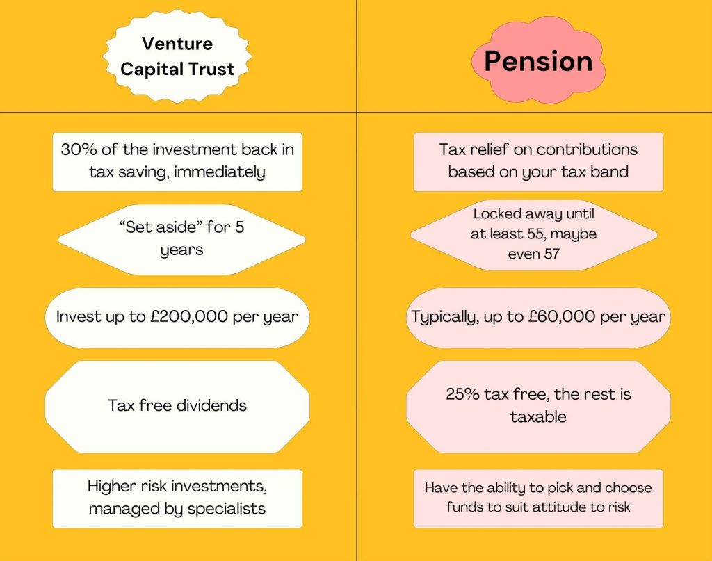 A VCT also gets tax relief, but unlike a pension there is a flat rate of tax relief of 30%.