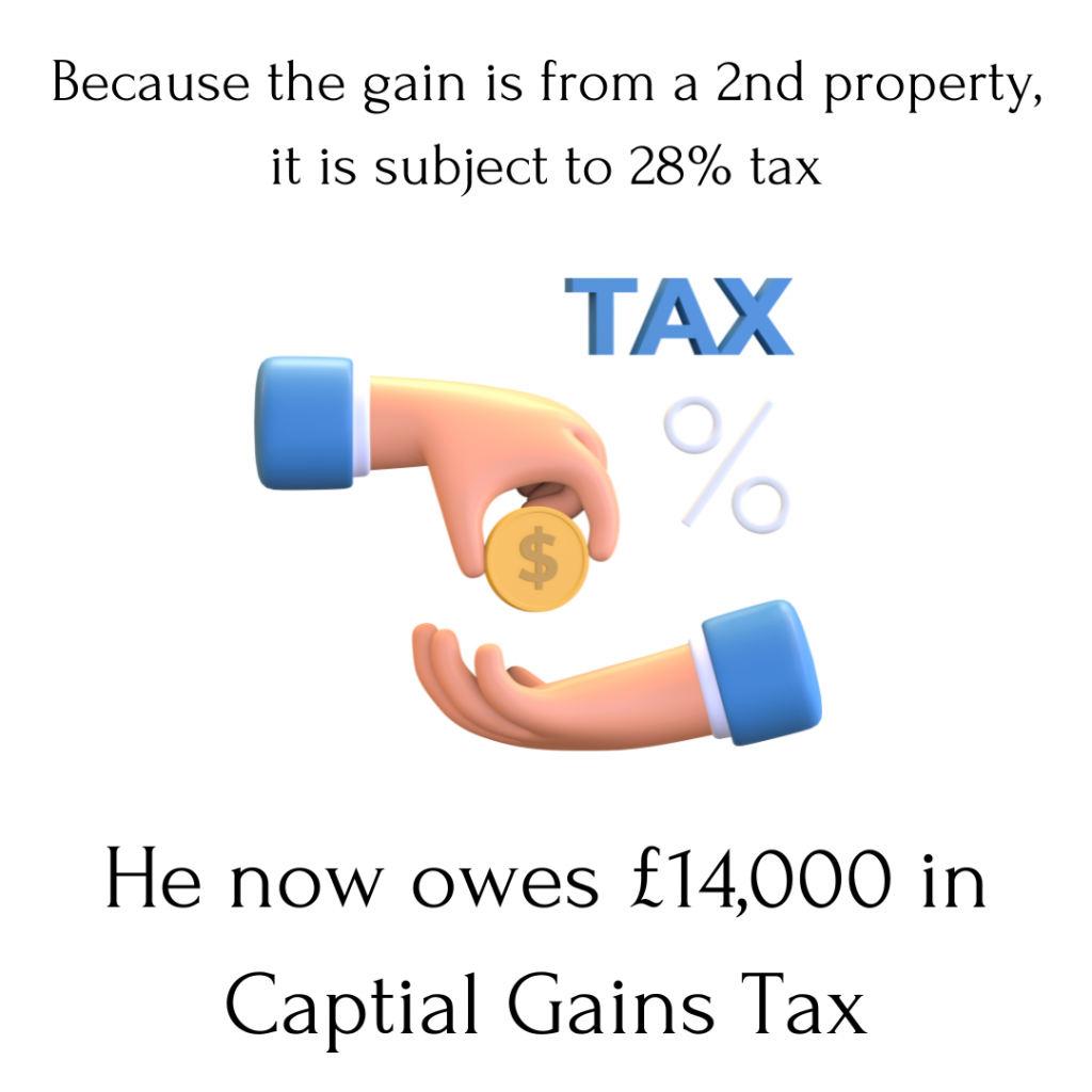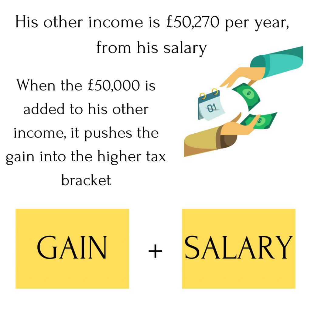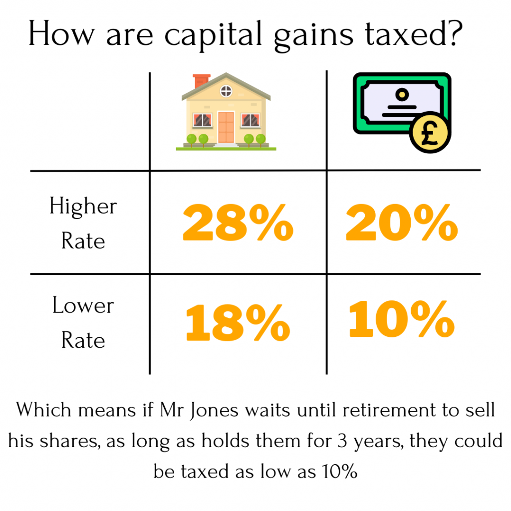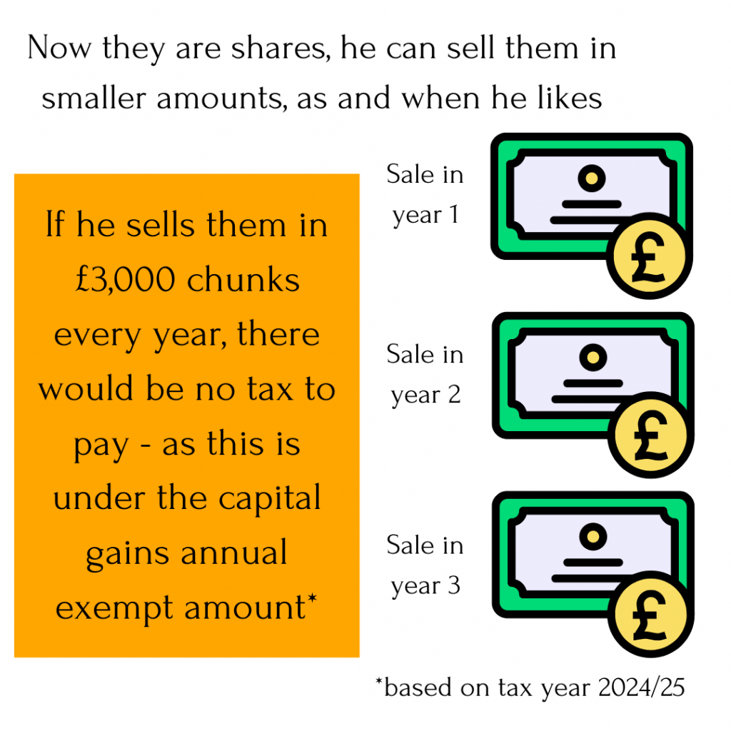 But he has also retired now, and his income is only £20,000 per year. So, he sells half of it in March – £25,000. This is now subject to CGT. He has the CGT allowance to set off against this gain, which means that he does not pay tax on the first £12,300 (currently). So he has CGT to pay on around £12,700. Now, two things have happened, his income is below the higher rate tax threshold, even with the extra £12,700, and he has converted the gain to one based on shares. So, in this instance he pays CGT of 10% of the £12,700, which amounts to £1,270.