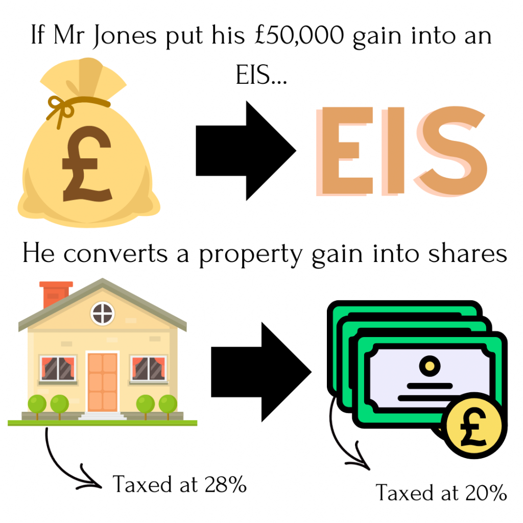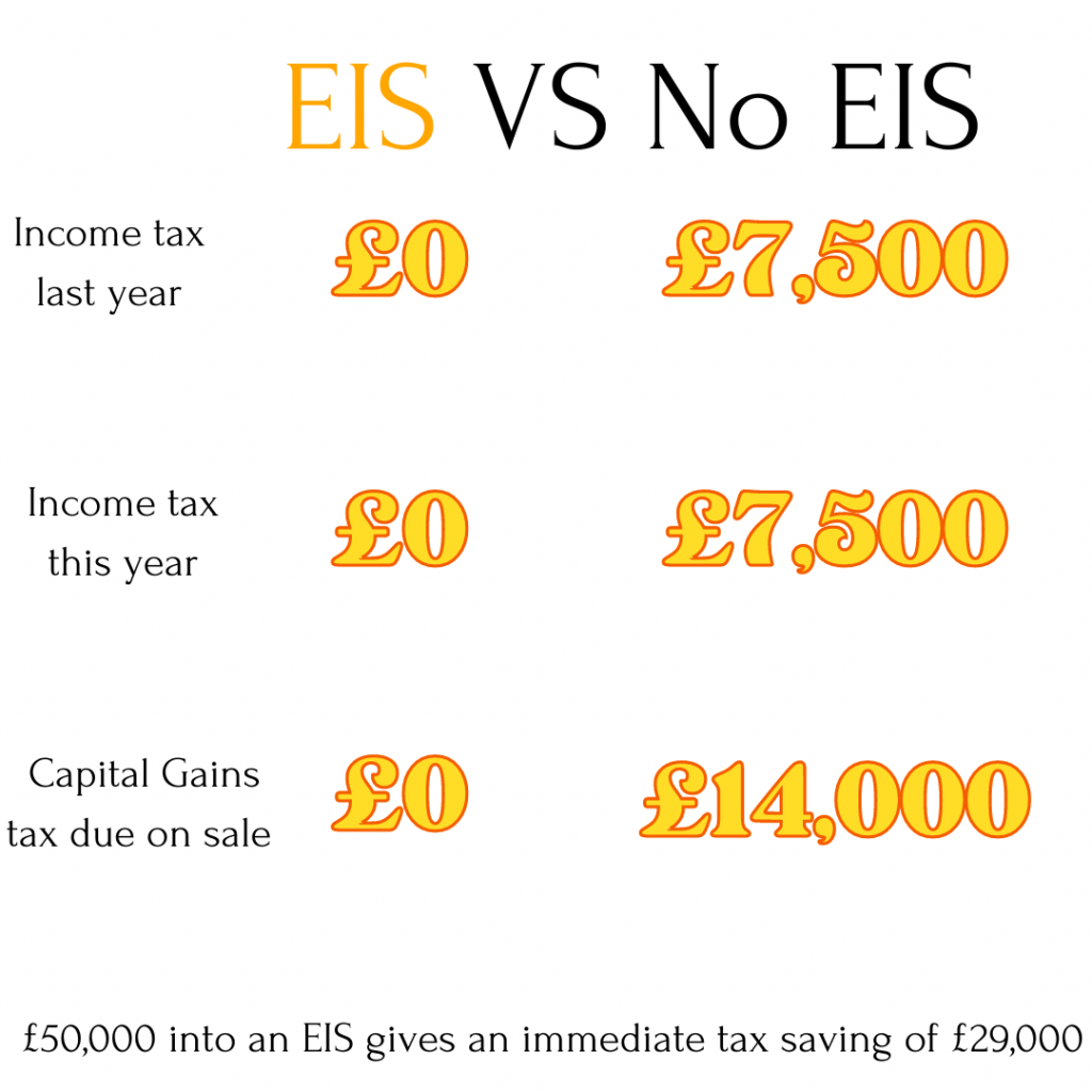 With his £50,000 investment into an EIS, he instantly delays his CGT liability, AND can have his income tax bill wiped out for this and last tax year.