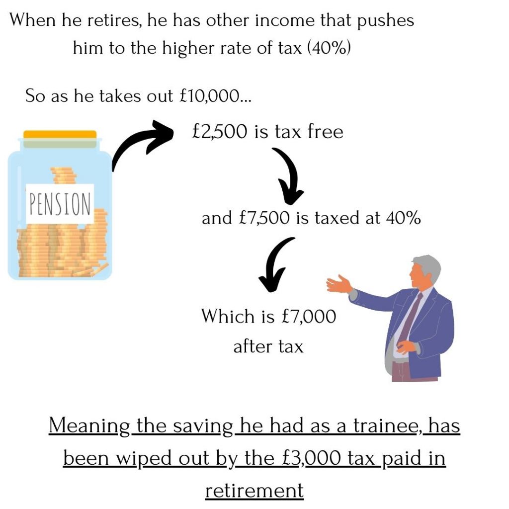 He’s successful in his career, and eventually retires. When he retires, he is a higher rate tax payer meaning…