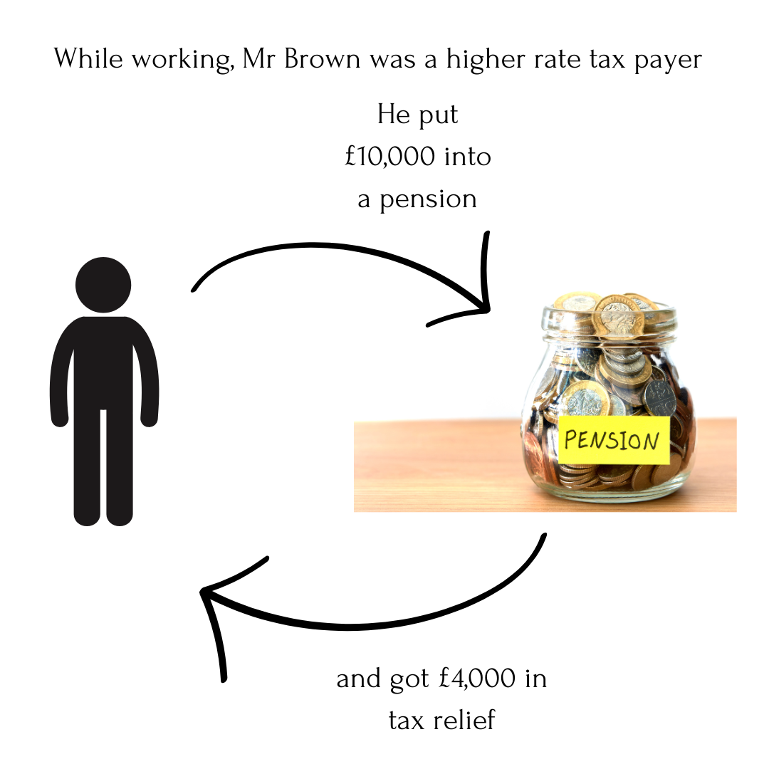 Whilst he was working, Mr Brown was a higher rate tax payer. He decided to pay £10,000 into a pension, and in doing so saves £4,000 in tax.