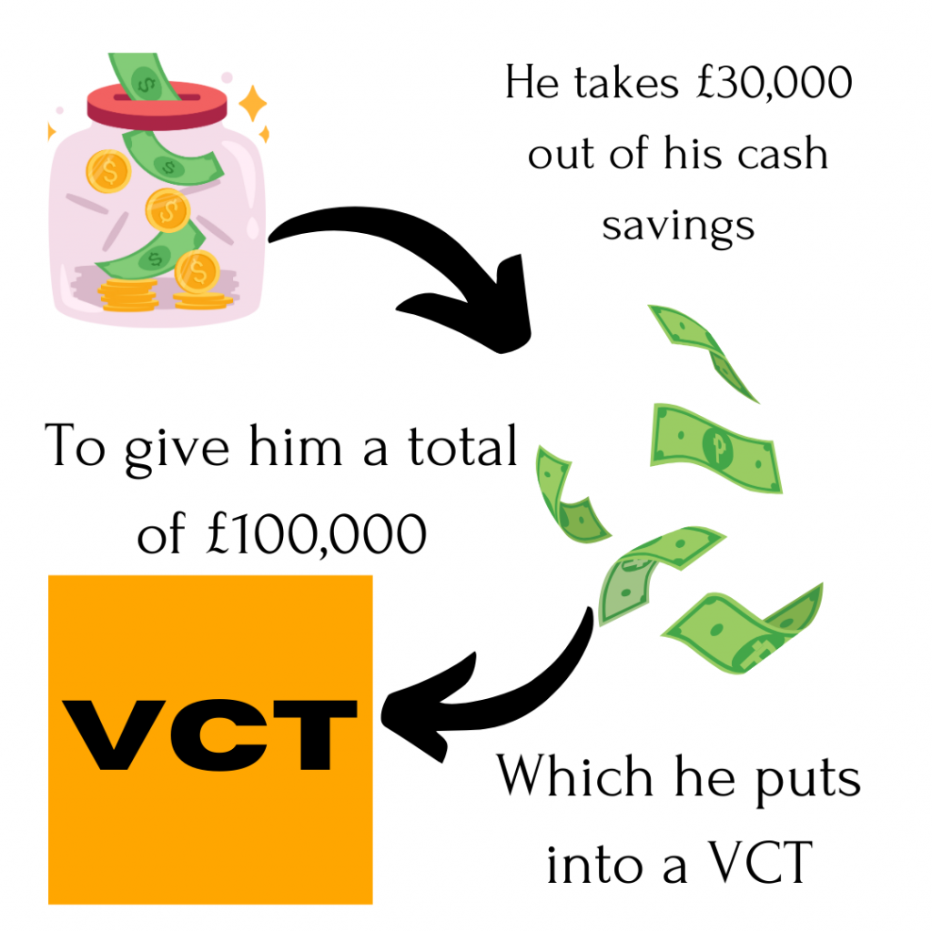 He invests this £100,000 in a VCT, using an extra £30,000 from his cash savings.