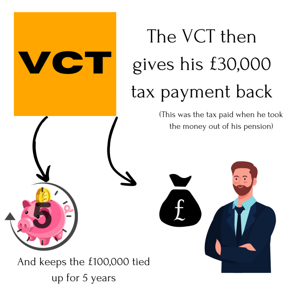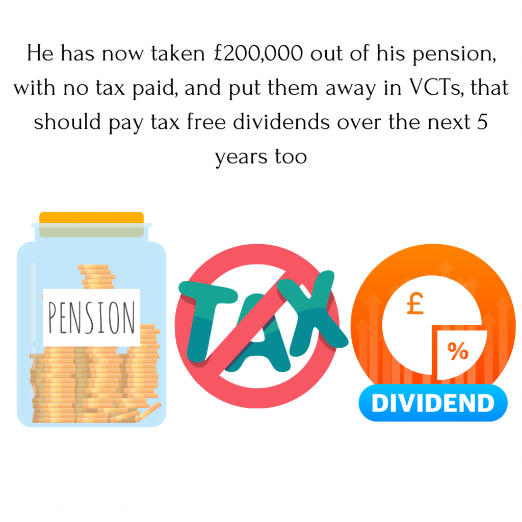 This example assumes no growth or return on the VCT, and the fact that it might be bad idea from an inheritance tax point of view to take funds out of the pension. (Although some VCTs are qualify for business property relief, and would escape inheritance tax after two years).
